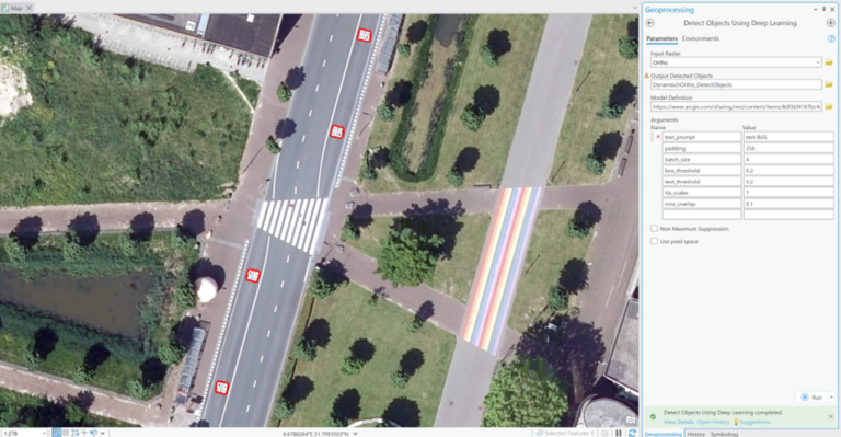 Voordat u enthousiast aan de slag gaat met dit model, is het belangrijk om te weten wat u nodig heeft om het model succesvol te gebruiken. Dit leest u op de informatiepagina van het Text SAM model. Heeft u alles in huis? Top! Dan kunt u beeldmateriaal, zoals foto’s, dronebeelden of satellietfoto’s, bij elkaar verzamelen voor uw interessegebied. Met behulp van de geoprocessingtool ‘Detect Objects Using Deep Learning’, kunt u de model definition van Text SAM inladen. De beelden worden, samen met de tekstinvoer, in Text SAM geladen en zo worden de gewenste objecten gesegmenteerd. Na het controleren en verfijnen van de resultaten, laadt u deze in ArcGIS Pro voor verdere analyse en visualisatie.