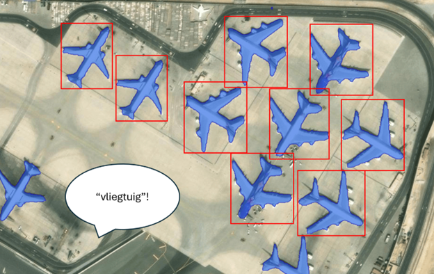 Text SAM is een combinatie van twee modellen: Grounding DINO en Segment Anything Model (SAM). Het Grounding DINO model analyseert een ingevoerde afbeelding (of imagery layer) en probeert hierin patronen te herkennen, die overeenkomen met objecten die het model kent. Door gebruik te maken van geavanceerde taalmodellen, begrijpt het model een vrije tekstinvoer. Hierdoor hoeft u geen gebruik te maken van voorgedefinieerde labels, maar kunt u alles invoeren wat u wilt, zoals ‘rode auto’ of ‘vliegtuig’. Het model zet de ingevoerde tekst om in numerieke waarden, waarmee met model zoekt naar objecten in de afbeelding die overeenkomen met deze waarden. Het resultaat van het Grounding DINO model, zijn bounding boxes rondom het object: kaders die de objecten definiëren.