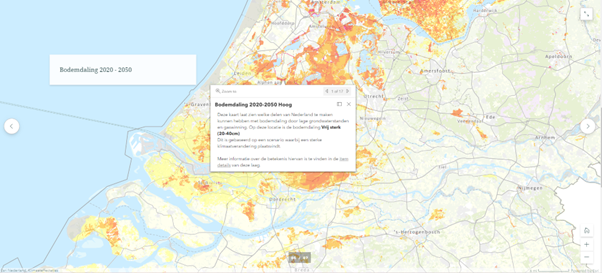 Maar ook naar de bodemdaling. Ook dat is een belangrijke factor, want in een droger en warmer klimaat versnelt en verergert de daling van de bodem. Allebei deze datasets zijn beschikbaar in de Levende Atlas van Esri en vrij te gebruiken door gebruikers van ArcGIS.