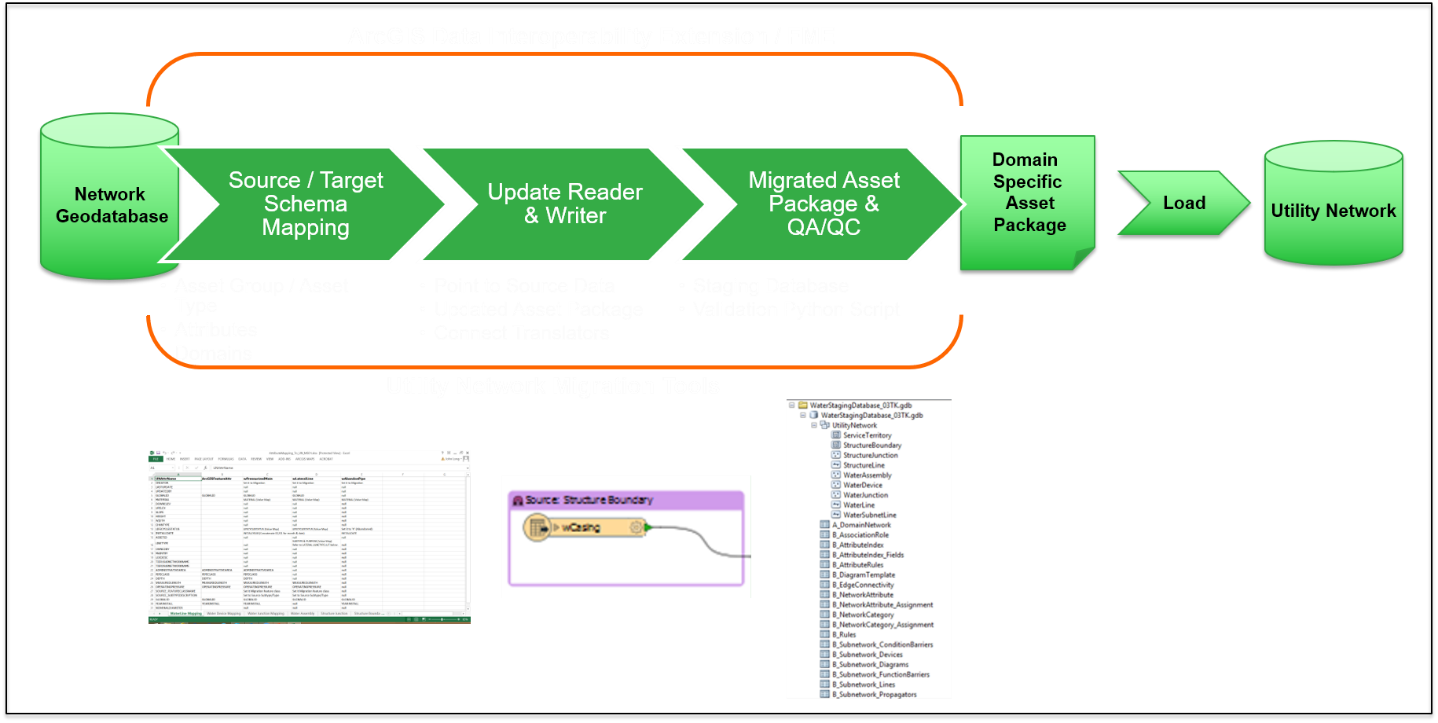 Vanuit een bron-geodatabase wordt door middel van een Schema Mapping (Excel-werkboek) en een FME Workbench data conform het nieuwe datamodel en Utility Network Management-regels en andere stamdata in een Asset Package gelezen. Dit Asset Package wordt vervolgens met een standaard importfunctie geladen in een omgeving. Er zijn voorbeeld Schema Mappings en FME Workbenches voor de diverse domeinen (elektriciteit, gas en water). Deze voorbeelden gaan uit van de bij de extensie meegeleverde sample database modellen. Ze zijn een goed uitgangspunt om een nieuwe ‘mapping’ op te zetten voor andere bronmodellen.