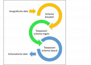 De stappen, die in een dergelijk proces worden doorlopen, zijn in de figuur hierboven weergegeven. Vanuit de geografische gegevens (selectieset of traceresultaat) wordt een initieel schema gebouwd, waarbij er voor alle betrokken assets schema representaties (edges en junctions, lees lijn- en puntvormige structuren) ontstaan. Vervolgens kunnen er meerdere beschikbare schemaregels worden toegepast. Het doel hiervan is reduceren of toevoegen van bepaalde objecten, edges of junctions. Het wel of niet weergeven van een container met inhoudelijke componenten zoals station, kast of een HDPE-buis, met kabels tot fibers daarbinnen, of de relatie met dragende structuren. Denk aan een hoogspanningsmast. Als laatste stap kunnen dan een of meerder layouts (orthogonaal, boomstructuur) worden toegepast om tot een uiteindelijke schemakaart te komen.