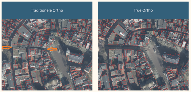 Dat is makkelijk uit te leggen aan de hand van een voorbeeld. Bij het plannen van werkzaamheden worden luchtfoto’s bekeken om te zien hoe de situatie is. Met de traditionele luchtfoto’s is veel te zien, maar niet alles; want wat gebeurt er achter de rij gebouwen? Is er een fietspad of een stoep? (zie ook de figuur hieronder). Ook zal met de traditionele luchtfoto’s het eigen netwerk niet op de juiste plek liggen, het ligt niet in het gebouw maar natuurlijk onder de stoep. Met True Ortho is de situatie dus wel goed te zien; simpel, maar enorm krachtig.